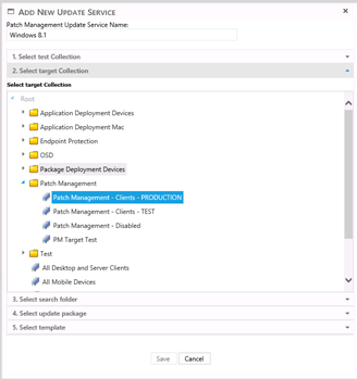 Each update service must have a name; this name is added to the top of the window in the naming text. Next a test collection is selected, this collection is used to automatic deploy the patches to, this must consist of a small representation of the devices that the patches is target to. The window will show all collection in a tree form, and the desired collection can be browsed a selected.