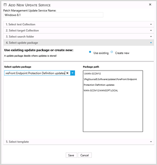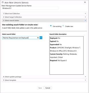 In this step, the search folder is either selected or a new is created. The search folder states which patches that need to be applied, and when selecting one in the drop down, a short description of the update service will appear in the text box.