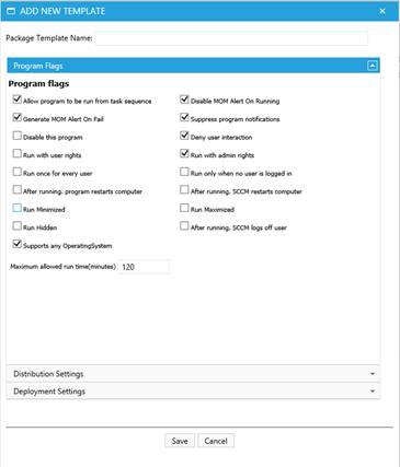 The first panel is for settings applicable to the program being created with the template, allowing you to control how the installation of the package is to run. It also allows specifying Operating System requirements for packages.