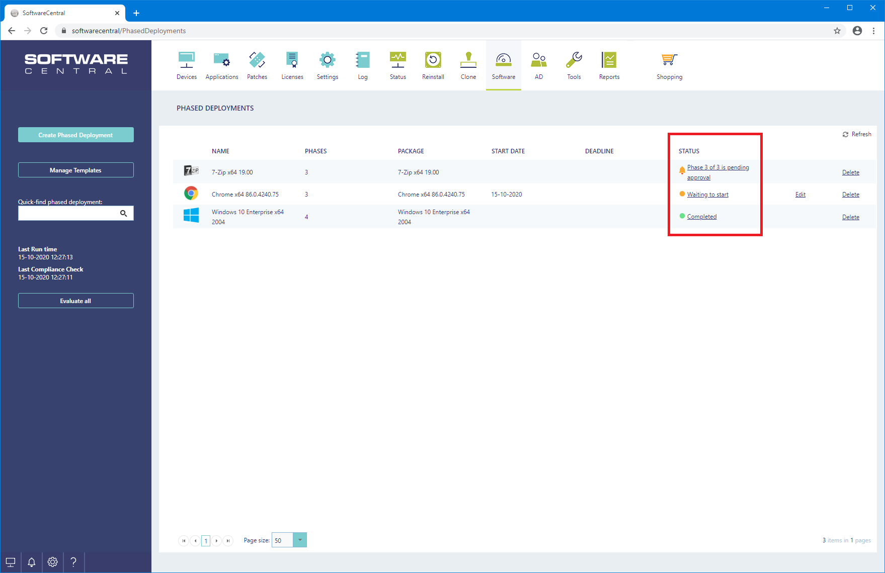 From the Phased Deployments interface you can view the current status of a phased deployment.