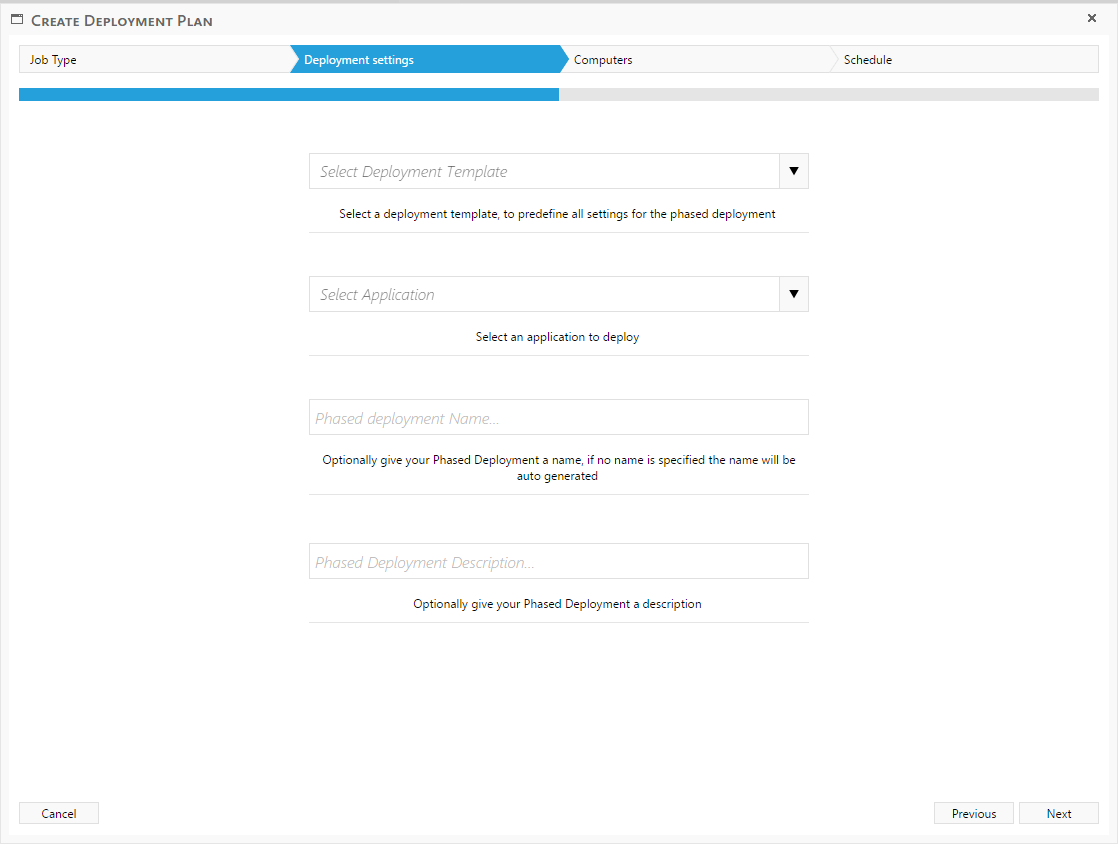 In the next step there is two mandatory fields where there must be selected a value, the first is the deployment template, this template has all the predefined settings needed to create a phased deployment.