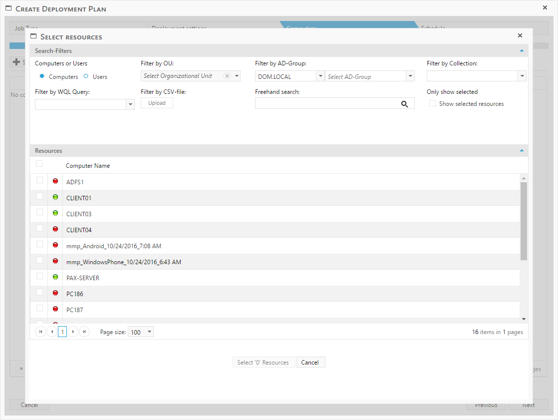 In this window, resources can be filtered, so the correct resources is easily found. The resources must be selected and then press “Select x Resources” this will return the user to the computers overview.