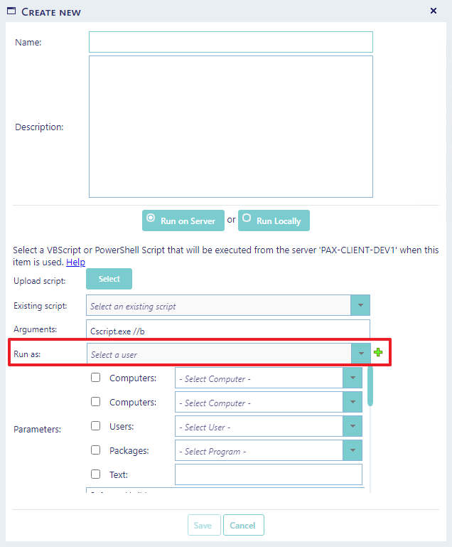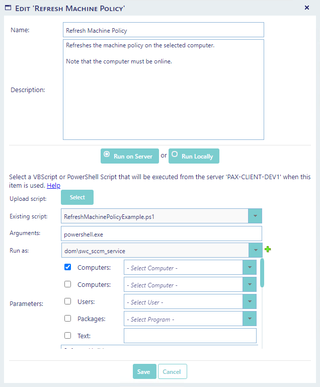 The run on server functionality allows the tool to execute a script on the server hosting SoftwareCentral. VBScripts and PowerShell Scripts are supported.