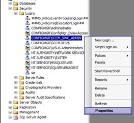 Locate the SCCM_SWC_ADMIN SQL login created in section 2.2 in the Security Logins folder. Right-Click it and choose “Properties” from the context-menu.