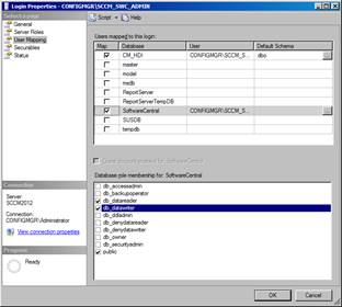 Choose User Mappings and map the SoftwareCentral database. Grant the SCCM_SWC_ADMIN database user db_datareader and db_datawriter permissions on the SoftwareCentral database and click OK. |