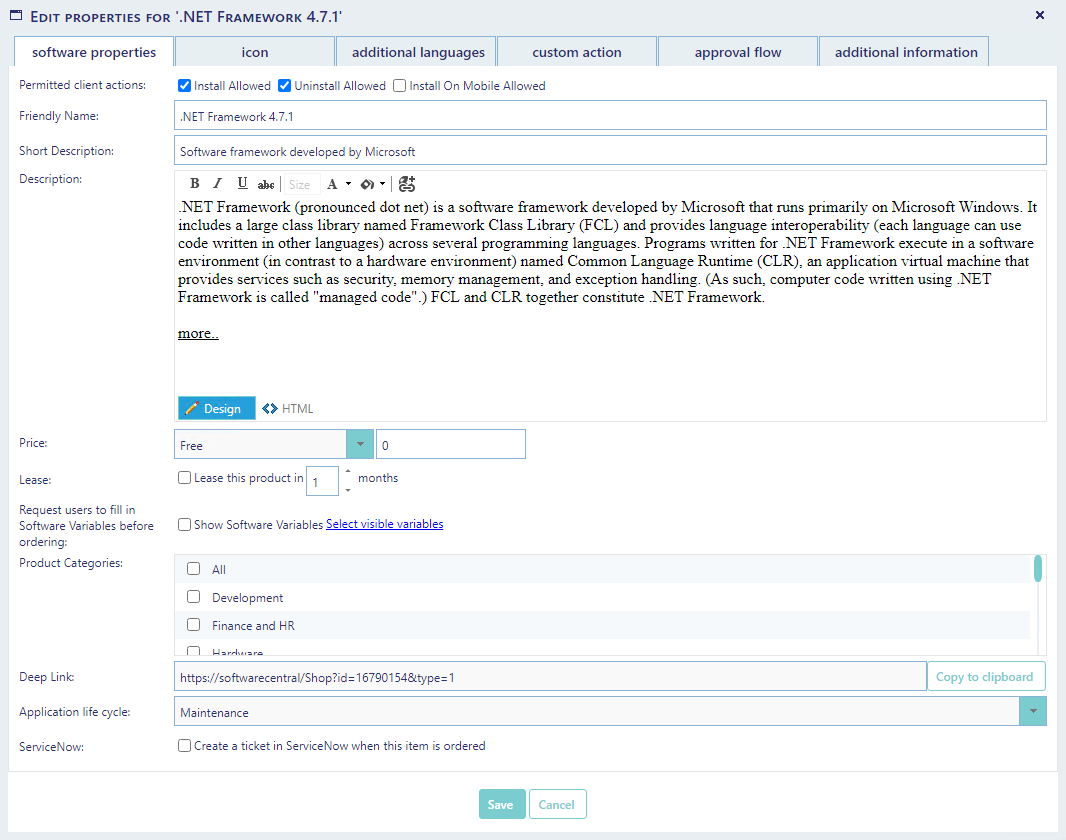 Application life cycle: Is used to set the life cycle of the application. The life cycle "Test" is orderable for users, but it will be flagged with a "Test" in the shop. "Inactive" will make the application visible in the shop, but it cannot be ordered.