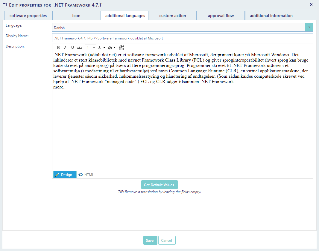 Additional Languages can add translations for the name and description. Use the drop-down box at the top to select the language you wish to add / edit.