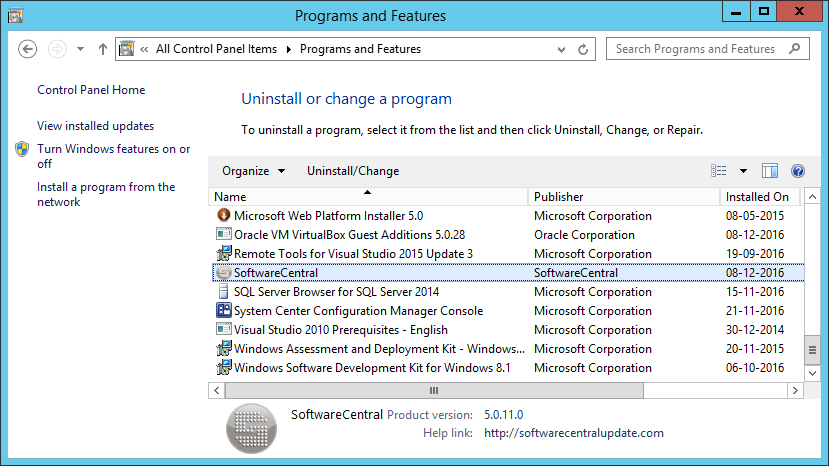 If you need to remove SoftwareCentral from a server, you can uninstall SoftwareCentral from the Programs and Features on the server where SoftwareCentral is installed: