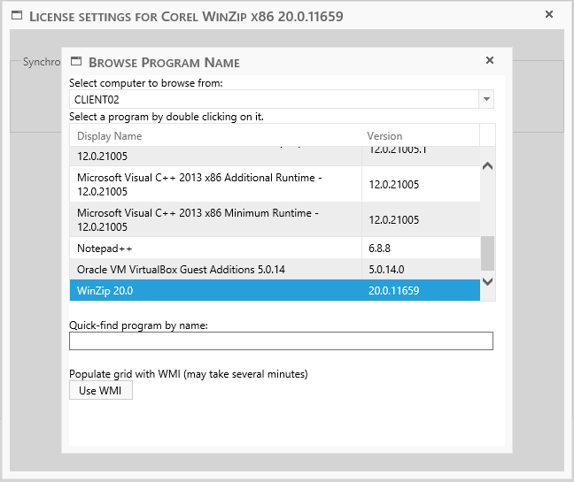 When browsing to a program, a new window opens. Select a computer where the program is installed and locate the program name. If the list is empty or the program was recently installed, use the "Use WMI" button to pull the data directly from the client.
